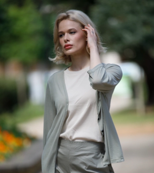 חולצה מעט רחוקה מהגוף. צווארון סירה סגור, נופל ברכות.
